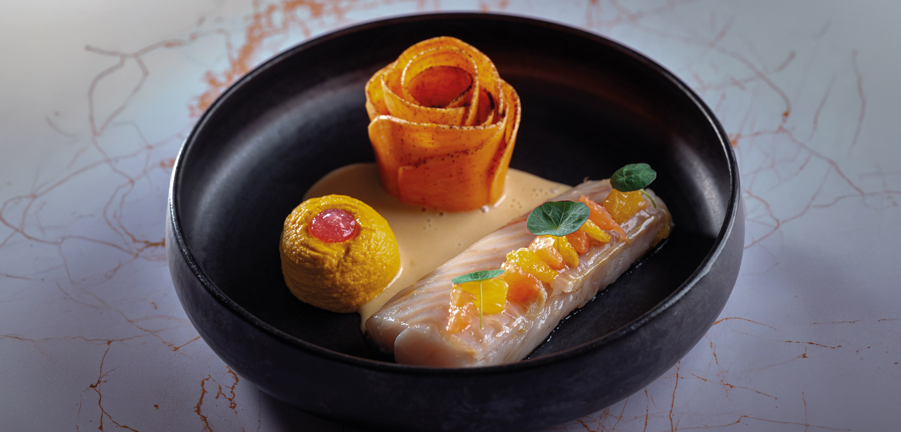 Dos de cabillaud nacré, sauce passion, pétales de butternut et pluie d’agrumes