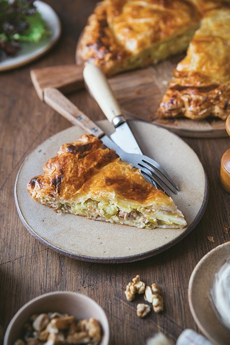 Ronde et dorée, volontairement végétarienne (une garniture à base de pommes de terre, de poireaux, de Saint-Marcellin), cette première « Recette de l’Isère » se déguste aussi bien chaude tout juste sortie du four que tiède, accompagnée d’une salade verte.